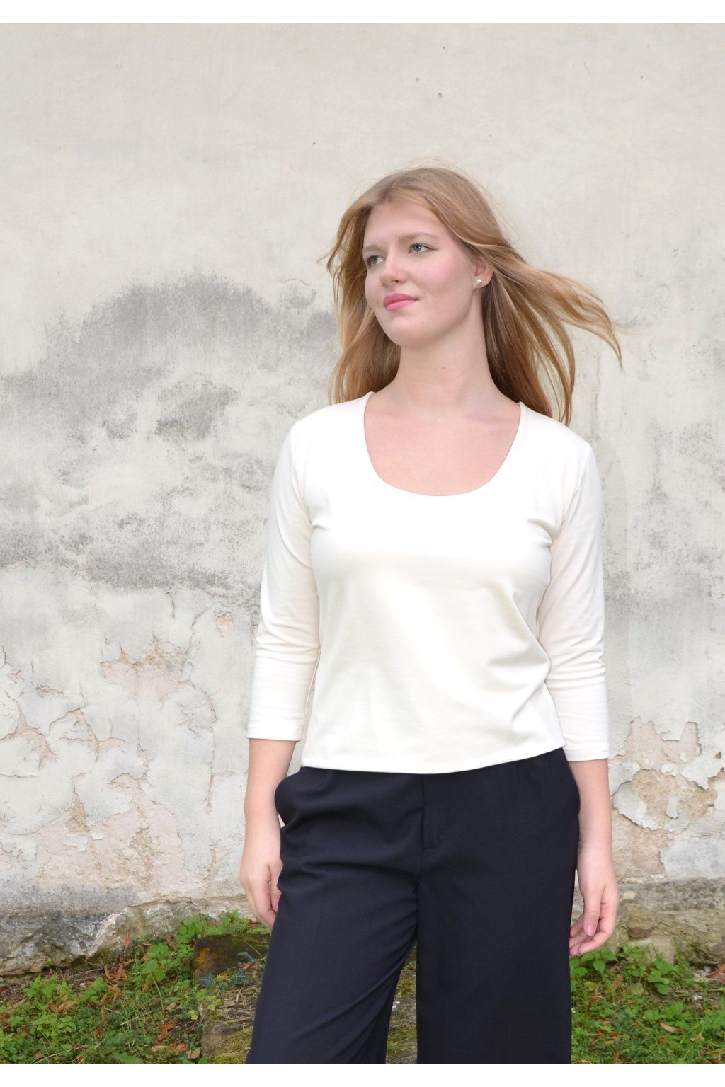 Triko šijeme ve smetanovém přirozeném odstínu biobavlny. V nabídce jsou i další nebarvené přirozené odstíny biobavlny - stone a oříškově hnědá. Jedinou barvenou biobavlněnou látkou je varianta - černá. Pokud chcete triko z bambusu, tedy pocitově tenčí a chladivější variantu, v nabídce je opět smetanový nebarvený odstín a další barevné barvené varianty. Všechny tyto barvené bambusové varianty jsou pouze na vyžádání.